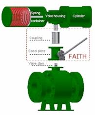 執(zhí)行器通過旋轉(zhuǎn)連接件與閥門連接。連接件的底部于閥桿連接,頂部與執(zhí)行器的驅(qū)動頭連接。 支座安裝在閥門法蘭上以制成執(zhí)行器。 緊急情況下,彈簧儲存的能量推動閥門到關(guān)閉位置。 通過替換原有的制作和連接件,F(xiàn)AITH系統(tǒng)集成到新的制作和連接件中。在測試中,F(xiàn)AITH系統(tǒng)只允許旋轉(zhuǎn)的連接件做一定角度的轉(zhuǎn)動,如20度(也可選其他角度)。